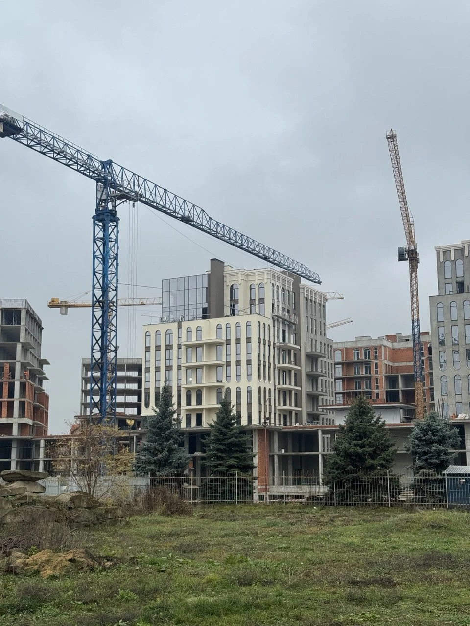 У середній частині комплексу — справжній ривок. Поки передні будинки переходять до оздоблення, секції 5–10 активно трансформуються з «каркасів» у повноцінні житлові будівлі.